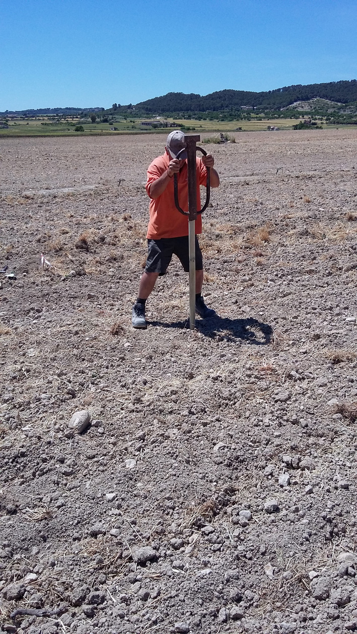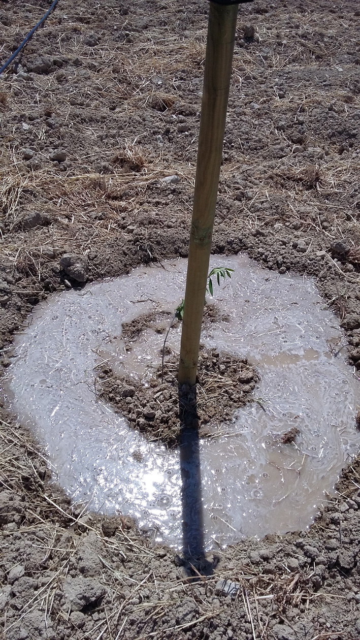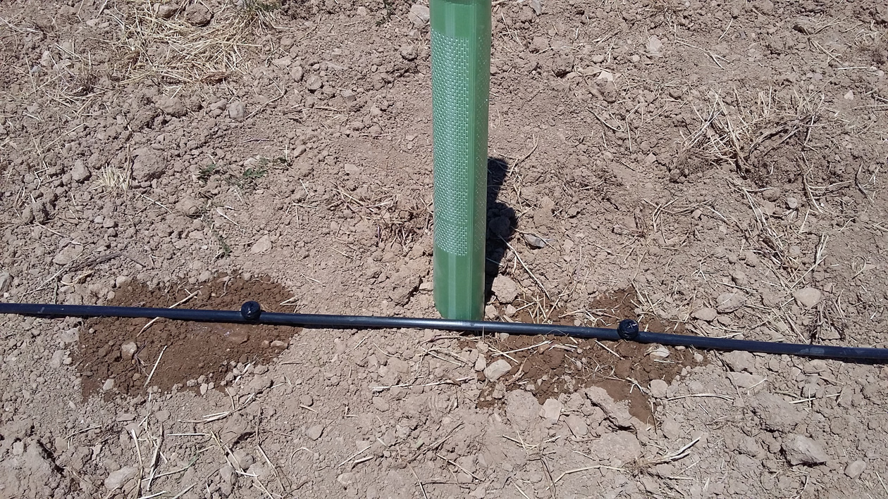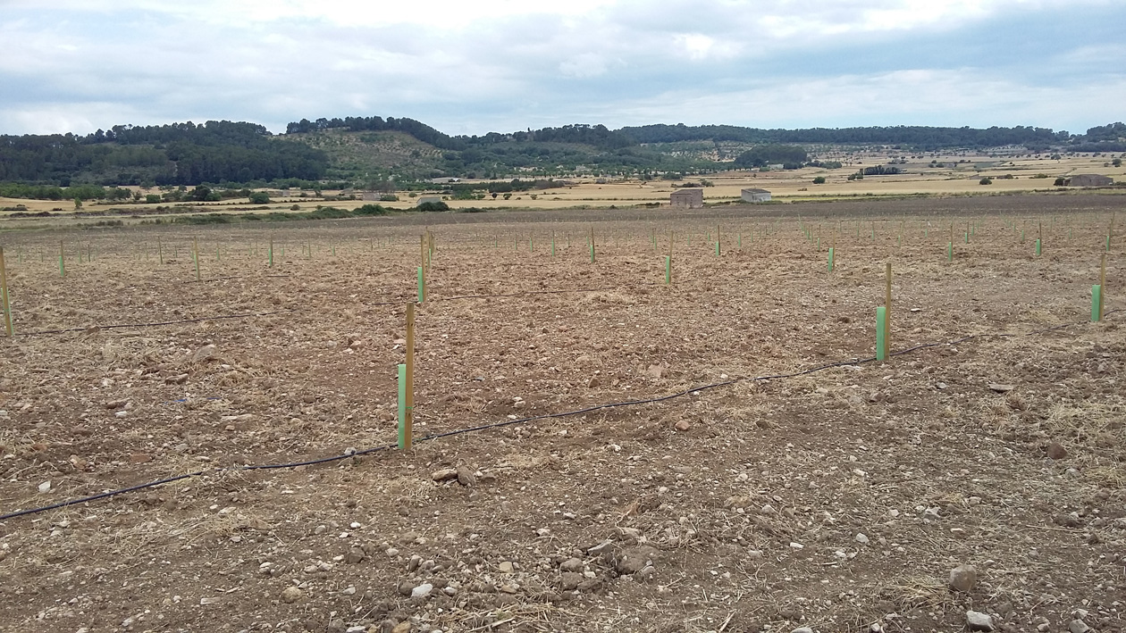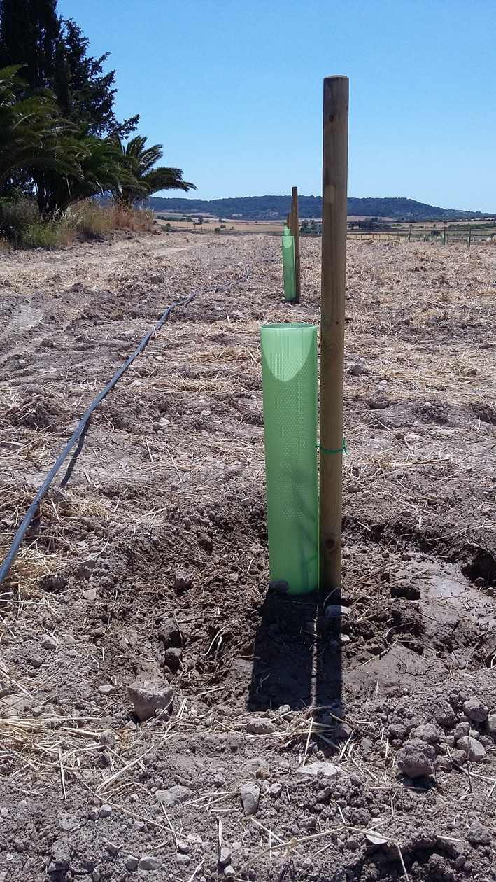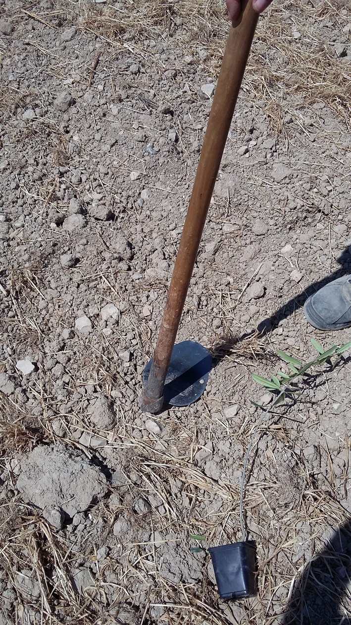 sembrar oliveres primer les estaques una aixada i una olivera primera regada ben regada els protectors dos punts de goteig mil nou-centes llestes
